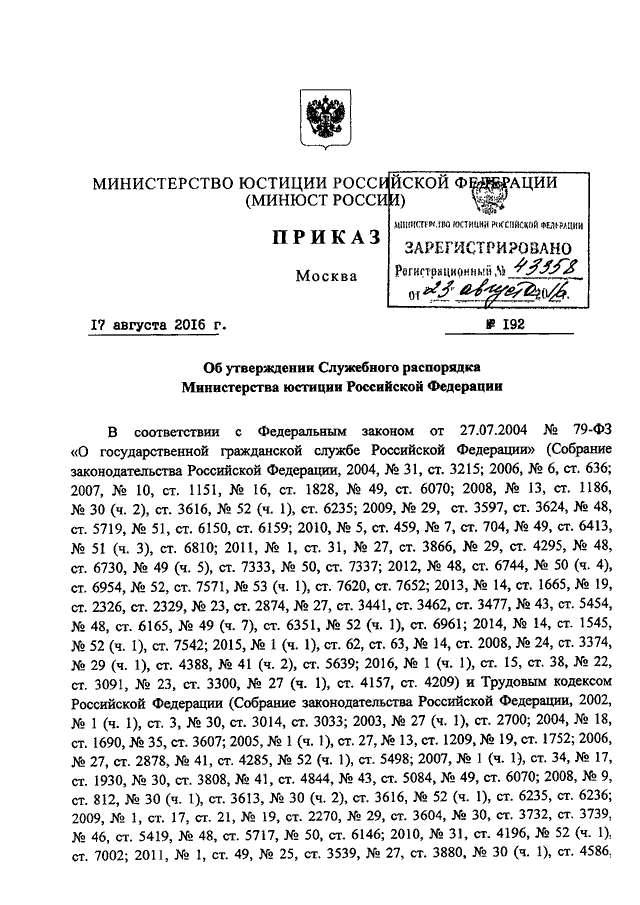 ПРИКАЗ Минюста РФ от 17.08.2016 N 192