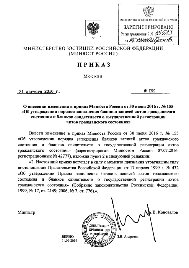 ПРИКАЗ Минюста РФ от 31.08.2016 N 199