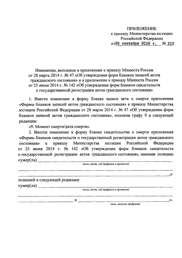 "О ВНЕСЕНИИ ИЗМЕНЕНИЙ В ПРИЛОЖЕНИЕ К ПРИКАЗУ МИНЮСТА РОССИИ ОТ 28 МАРТА 2014 Г. N 47 "ОБ УТВЕРЖДЕНИИ ФОРМ БЛАНКОВ ЗАПИСЕЙ АКТОВ ГРАЖДАНСКОГО СОСТОЯНИЯ" И В ПРИЛОЖЕНИЕ К ПРИКАЗУ МИНЮСТА РОССИИ ОТ 25 ИЮНЯ 2014 Г. N 142 "ОБ УТВЕРЖДЕНИИ ФОРМ БЛАНКОВ СВИДЕТЕЛЬСТВ О ГОСУДАРСТВЕННОЙ РЕГИСТРАЦИИ АКТОВ ГРАЖДАНСКОГО СОСТОЯНИЯ"