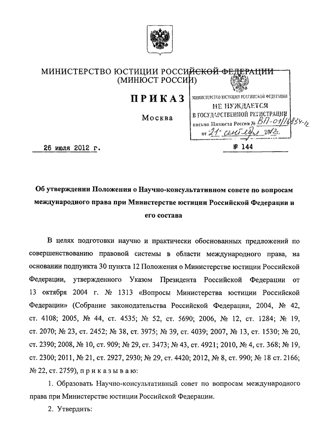 ПРИКАЗ Минюста РФ от 26.07.2012 N 144