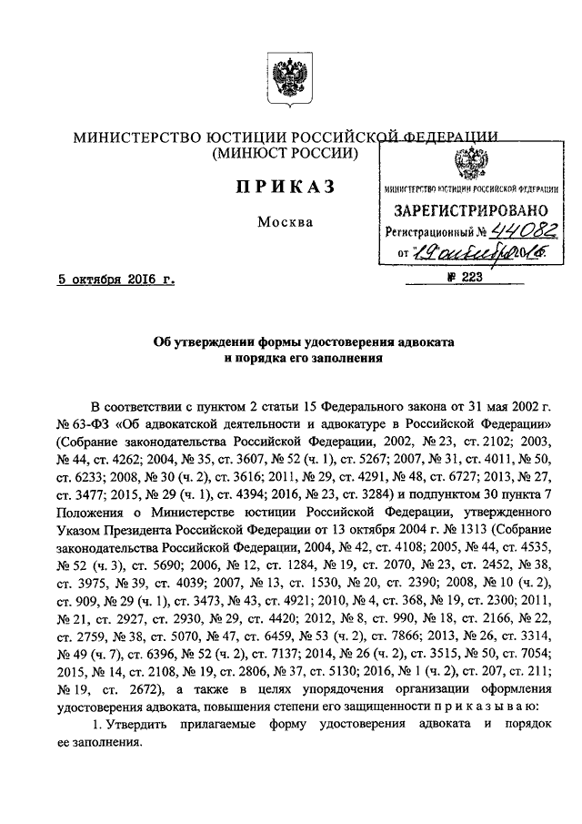 ПРИКАЗ Минюста РФ от 05.10.2016 N 223