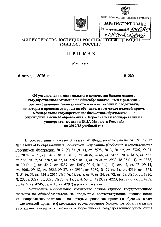 ПРИКАЗ Минюста РФ от 06.10.2016 N 230
