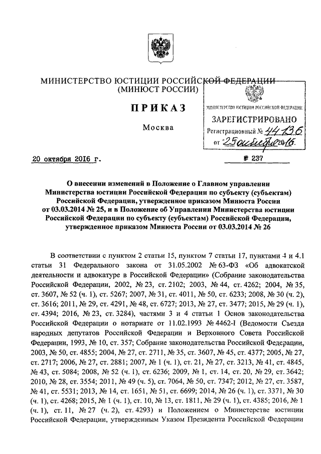ПРИКАЗ Минюста РФ от 20.10.2016 N 237