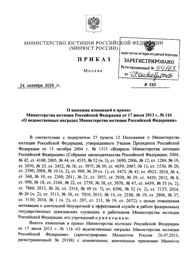 ПРИКАЗ Минюста РФ от 24.10.2016 N 243