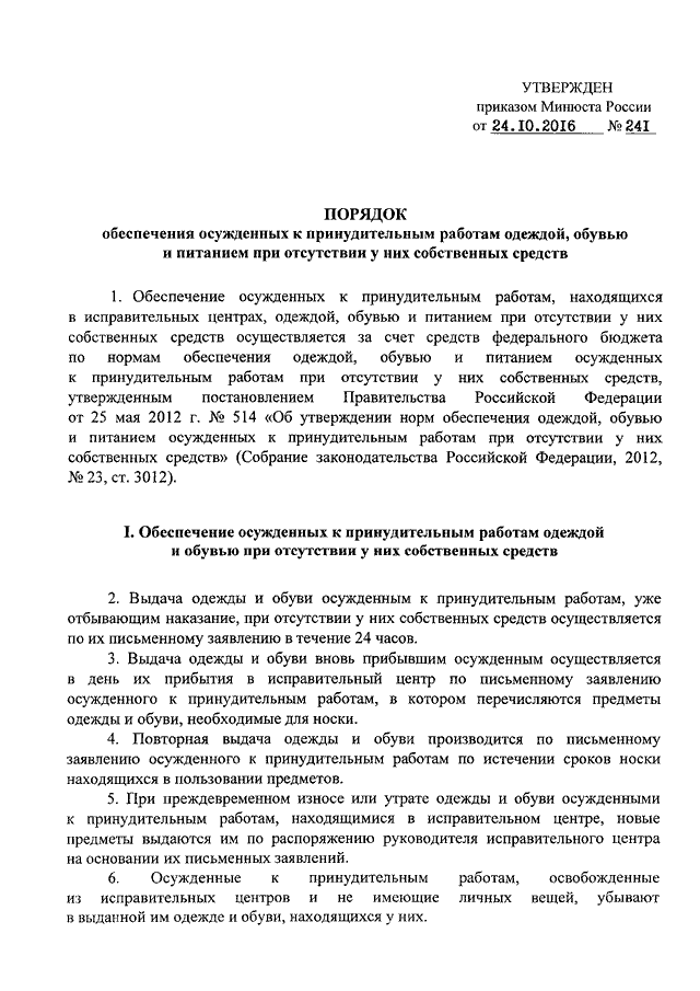 "ОБ УТВЕРЖДЕНИИ ПОРЯДКА ОБЕСПЕЧЕНИЯ ОСУЖДЕННЫХ К ПРИНУДИТЕЛЬНЫМ РАБОТАМ ОДЕЖДОЙ, ОБУВЬЮ И ПИТАНИЕМ ПРИ ОТСУТСТВИИ У НИХ СОБСТВЕННЫХ СРЕДСТВ"