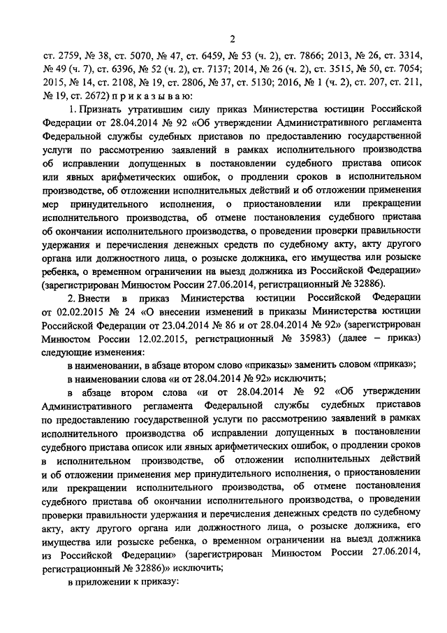 "О ПРИЗНАНИИ УТРАТИВШИМ СИЛУ ПРИКАЗА МИНИСТЕРСТВА ЮСТИЦИИ РОССИЙСКОЙ ФЕДЕРАЦИИ ОТ 28.04.2014 N 92 "ОБ УТВЕРЖДЕНИИ АДМИНИСТРАТИВНОГО РЕГЛАМЕНТА ФЕДЕРАЛЬНОЙ СЛУЖБЫ СУДЕБНЫХ ПРИСТАВОВ ПО ПРЕДОСТАВЛЕНИЮ ГОСУДАРСТВЕННОЙ УСЛУГИ ПО РАССМОТРЕНИЮ ЗАЯВЛЕНИЙ В РАМКАХ ИСПОЛНИТЕЛЬНОГО ПРОИЗВОДСТВА ОБ ИСПРАВЛЕНИИ ДОПУЩЕННЫХ В ПОСТАНОВЛЕНИИ СУДЕБНОГО ПРИСТАВА ОПИСОК ИЛИ ЯВНЫХ АРИФМЕТИЧЕСКИХ ОШИБОК, О ПРОДЛЕНИИ СРОКОВ В ИСПОЛНИТЕЛЬНОМ ПРОИЗВОДСТВЕ, ОБ ОТЛОЖЕНИИ ИСПОЛНИТЕЛЬНЫХ ДЕЙСТВИЙ И ОБ ОТЛОЖЕНИИ ПРИМЕНЕНИЯ МЕР ПРИНУДИТЕЛЬНОГО ИСПОЛНЕНИЯ, О ПРИОСТАНОВЛЕНИИ ИЛИ ПРЕКРАЩЕНИИ ИСПОЛНИТЕЛЬНОГО ПРОИЗВОДСТВА, ОБ ОТМЕНЕ ПОСТАНОВЛЕНИЯ СУДЕБНОГО ПРИСТАВА ОБ ОКОНЧАНИИ ИСПОЛНИТЕЛЬНОГО ПРОИЗВОДСТВА, О ПРОВЕДЕНИИ ПРОВЕРКИ ПРАВИЛЬНОСТИ УДЕРЖАНИЯ И ПЕРЕЧИСЛЕНИЯ ДЕНЕЖНЫХ СРЕДСТВ ПО СУДЕБНОМУ АКТУ, АКТУ ДРУГОГО ОРГАНА ИЛИ ДОЛЖНОСТНОГО ЛИЦА, О РОЗЫСКЕ ДОЛЖНИКА, ЕГО ИМУЩЕСТВА ИЛИ РОЗЫСКЕ РЕБЕНКА, О ВРЕМЕННОМ ОГРАНИЧЕНИИ НА ВЫЕЗД ДОЛЖНИКА ИЗ РОССИЙСКОЙ ФЕДЕРАЦИИ" И О ВНЕСЕНИИ ИЗМЕНЕНИЙ В ПРИКАЗ МИНИСТЕРСТВА ЮСТИЦИИ РОССИЙСКОЙ ФЕДЕРАЦИИ ОТ 02.02.2015 N 24 "О ВНЕСЕНИИ ИЗМЕНЕНИЙ В ПРИКАЗЫ МИНИСТЕРСТВА ЮСТИЦИИ РОССИЙСКОЙ ФЕДЕРАЦИИ ОТ 23.04.2014 N 86 И ОТ 28.04.2014 N 92"