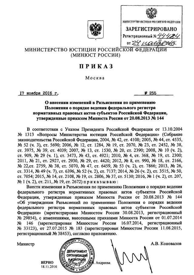 ПРИКАЗ Минюста РФ от 17.11.2016 N 255