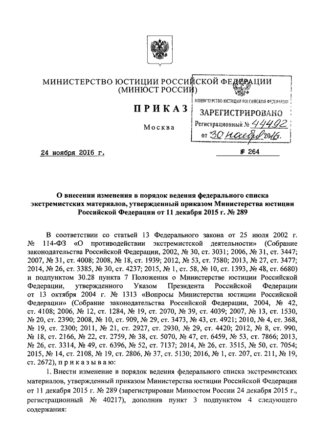 ПРИКАЗ Минюста РФ от 24.11.2016 N 264