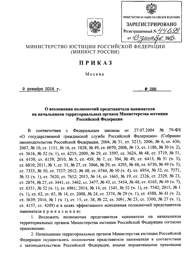 ПРИКАЗ Минюста РФ от 09.12.2016 N 286