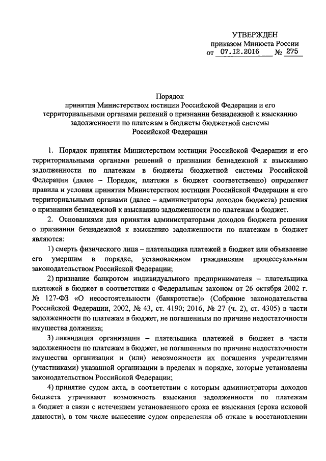 "ОБ УТВЕРЖДЕНИИ ПОРЯДКА ПРИНЯТИЯ МИНИСТЕРСТВОМ ЮСТИЦИИ РОССИЙСКОЙ ФЕДЕРАЦИИ И ЕГО ТЕРРИТОРИАЛЬНЫМИ ОРГАНАМИ РЕШЕНИЙ О ПРИЗНАНИИ БЕЗНАДЕЖНОЙ К ВЗЫСКАНИЮ ЗАДОЛЖЕННОСТИ ПО ПЛАТЕЖАМ В БЮДЖЕТЫ БЮДЖЕТНОЙ СИСТЕМЫ РОССИЙСКОЙ ФЕДЕРАЦИИ"