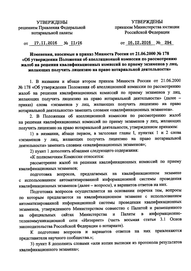 "О ВНЕСЕНИИ ИЗМЕНЕНИЙ В ПРИКАЗ МИНЮСТА РОССИИ ОТ 21.06.2000 N 178 "ОБ УТВЕРЖДЕНИИ ПОЛОЖЕНИЯ ОБ АПЕЛЛЯЦИОННОЙ КОМИССИИ ПО РАССМОТРЕНИЮ ЖАЛОБ НА РЕШЕНИЯ КВАЛИФИКАЦИОННЫХ КОМИССИЙ ПО ПРИЕМУ ЭКЗАМЕНОВ У ЛИЦ, ЖЕЛАЮЩИХ ПОЛУЧИТЬ ЛИЦЕНЗИЮ НА ПРАВО НОТАРИАЛЬНОЙ ДЕЯТЕЛЬНОСТИ" (Зарегистрировано в Минюсте РФ 20.12.2016 N 44794)