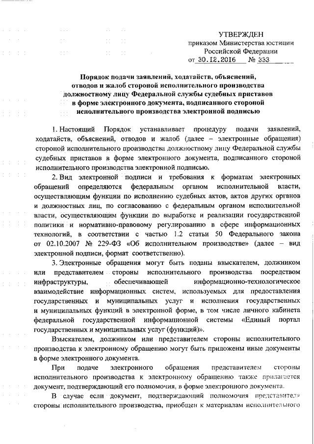 "ОБ УТВЕРЖДЕНИИ ПОРЯДКА ПОДАЧИ ЗАЯВЛЕНИЙ, ХОДАТАЙСТВ, ОБЪЯСНЕНИЙ, ОТВОДОВ И ЖАЛОБ СТОРОНОЙ ИСПОЛНИТЕЛЬНОГО ПРОИЗВОДСТВА ДОЛЖНОСТНОМУ ЛИЦУ ФЕДЕРАЛЬНОЙ СЛУЖБЫ СУДЕБНЫХ ПРИСТАВОВ В ФОРМЕ ЭЛЕКТРОННОГО ДОКУМЕНТА, ПОДПИСАННОГО СТОРОНОЙ ИСПОЛНИТЕЛЬНОГО ПРОИЗВОДСТВА ЭЛЕКТРОННОЙ ПОДПИСЬЮ"