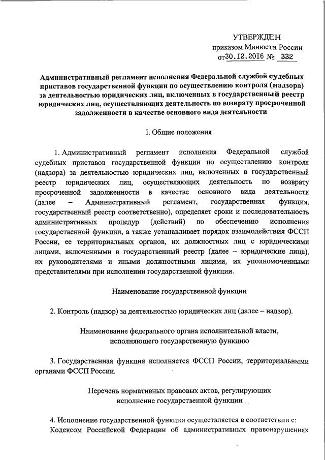 "ОБ УТВЕРЖДЕНИИ АДМИНИСТРАТИВНОГО РЕГЛАМЕНТА ИСПОЛНЕНИЯ ФЕДЕРАЛЬНОЙ СЛУЖБОЙ СУДЕБНЫХ ПРИСТАВОВ ГОСУДАРСТВЕННОЙ ФУНКЦИИ ПО ОСУЩЕСТВЛЕНИЮ КОНТРОЛЯ (НАДЗОРА) ЗА ДЕЯТЕЛЬНОСТЬЮ ЮРИДИЧЕСКИХ ЛИЦ, ВКЛЮЧЕННЫХ В ГОСУДАРСТВЕННЫЙ РЕЕСТР ЮРИДИЧЕСКИХ ЛИЦ, ОСУЩЕСТВЛЯЮЩИХ ДЕЯТЕЛЬНОСТЬ ПО ВОЗВРАТУ ПРОСРОЧЕННОЙ ЗАДОЛЖЕННОСТИ В КАЧЕСТВЕ ОСНОВНОГО ВИДА ДЕЯТЕЛЬНОСТИ"