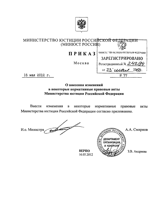 ПРИКАЗ Минюста РФ от 15.05.2012 N 77