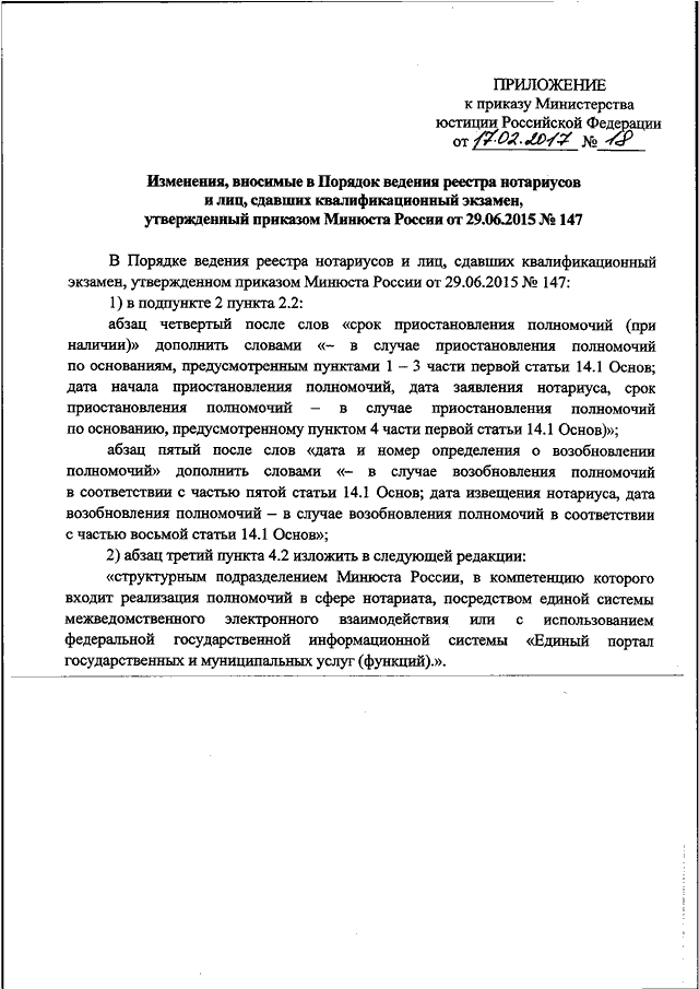 "О ВНЕСЕНИИ ИЗМЕНЕНИЙ В ПОРЯДОК ВЕДЕНИЯ РЕЕСТРА НОТАРИУСОВ И ЛИЦ, СДАВШИХ КВАЛИФИКАЦИОННЫЙ ЭКЗАМЕН, УТВЕРЖДЕННЫЙ ПРИКАЗОМ МИНЮСТА РОССИИ ОТ 29.06.2015 N 147"