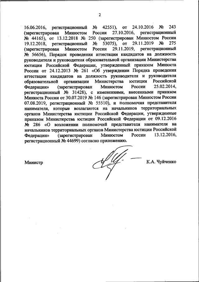 "О ВНЕСЕНИИ ИЗМЕНЕНИЙ В ПОРЯДОК НАГРАЖДЕНИЯ ВЕДОМСТВЕННЫМИ НАГРАДАМИ МИНИСТЕРСТВА ЮСТИЦИИ РОССИЙСКОЙ ФЕДЕРАЦИИ, УТВЕРЖДЕННЫЙ ПРИКАЗОМ МИНИСТЕРСТВА ЮСТИЦИИ РОССИЙСКОЙ ФЕДЕРАЦИИ ОТ 17.07.2013 N 116, ПОРЯДОК ПРОВЕДЕНИЯ АТТЕСТАЦИИ КАНДИДАТОВ НА ДОЛЖНОСТЬ РУКОВОДИТЕЛЯ И РУКОВОДИТЕЛЯ ОБРАЗОВАТЕЛЬНОЙ ОРГАНИЗАЦИИ МИНИСТЕРСТВА ЮСТИЦИИ РОССИЙСКОЙ ФЕДЕРАЦИИ, УТВЕРЖДЕННЫЙ ПРИКАЗОМ МИНЮСТА РОССИИ ОТ 24.12.2013 N 261, ПОЛНОМОЧИЯ ПРЕДСТАВИТЕЛЯ НАНИМАТЕЛЯ, КОТОРЫЕ ВОЗЛАГАЮТСЯ НА НАЧАЛЬНИКОВ ТЕРРИТОРИАЛЬНЫХ ОРГАНОВ МИНИСТЕРСТВА ЮСТИЦИИ РОССИЙСКОЙ ФЕДЕРАЦИИ, УТВЕРЖДЕННЫЕ ПРИКАЗОМ МИНИСТЕРСТВА ЮСТИЦИИ РОССИЙСКОЙ ФЕДЕРАЦИИ ОТ 09.12.2016 N 2862"
