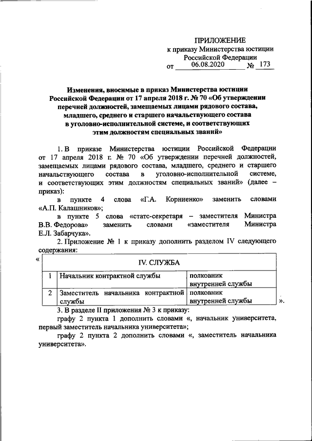 "О ВНЕСЕНИИ ИЗМЕНЕНИЙ В ПРИКАЗ МИНИСТЕРСТВА ЮСТИЦИИ РОССИЙСКОЙ ФЕДЕРАЦИИ ОТ 17 АПРЕЛЯ 2018 Г. N 70 "ОБ УТВЕРЖДЕНИИ ПЕРЕЧНЕЙ ДОЛЖНОСТЕЙ, ЗАМЕЩАЕМЫХ ЛИЦАМИ РЯДОВОГО СОСТАВА, МЛАДШЕГО, СРЕДНЕГО И СТАРШЕГО НАЧАЛЬСТВУЮЩЕГО СОСТАВА В УГОЛОВНО - ИСПОЛНИТЕЛЬНОЙ СИСТЕМЕ, И СООТВЕТСТВУЮЩИХ ЭТИМ ДОЛЖНОСТЯМ СПЕЦИАЛЬНЫХ ЗВАНИЙ"