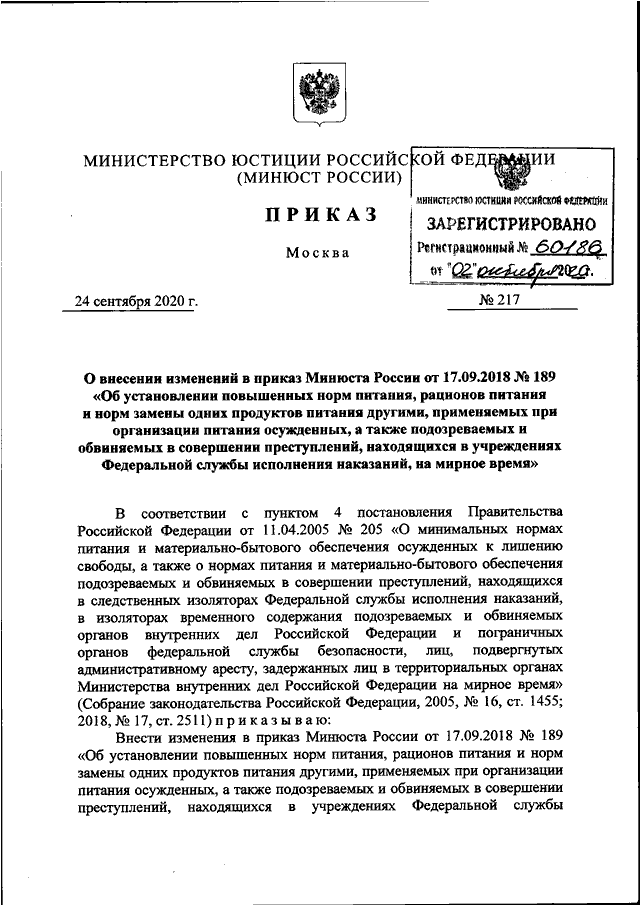 ПРИКАЗ Минюста РФ от 24.09.2020 N 217