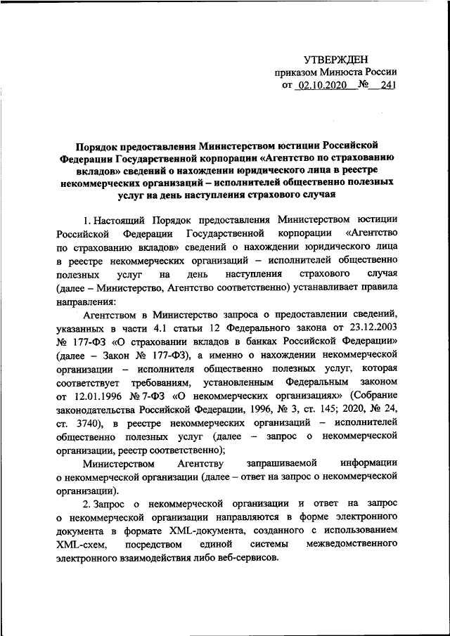 ПРИКАЗ Минюста РФ от 02.10.2020 N 241