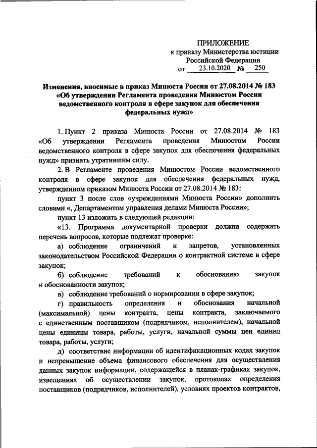 "О ВНЕСЕНИИ ИЗМЕНЕНИЙ В ПРИКАЗ МИНЮСТА РОССИИ ОТ 27.08.2014 N 183 "ОБ УТВЕРЖДЕНИИ РЕГЛАМЕНТА ПРОВЕДЕНИЯ МИНЮСТОМ РОССИИ ВЕДОМСТВЕННОГО КОНТРОЛЯ В СФЕРЕ ЗАКУПОК ДЛЯ ОБЕСПЕЧЕНИЯ ФЕДЕРАЛЬНЫХ НУЖД"