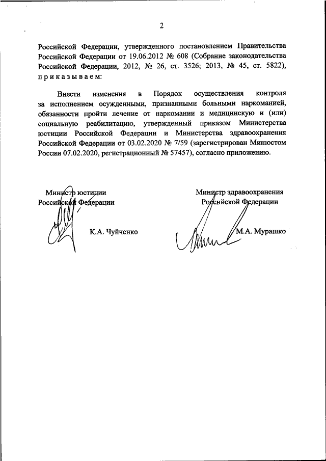 "О ВНЕСЕНИИ ИЗМЕНЕНИЙ В ПОРЯДОК ОСУЩЕСТВЛЕНИЯ КОНТРОЛЯ ЗА ИСПОЛНЕНИЕМ ОСУЖДЕННЫМИ, ПРИЗНАННЫМИ БОЛЬНЫМИ НАРКОМАНИЕЙ, ОБЯЗАННОСТИ ПРОЙТИ ЛЕЧЕНИЕ ОТ НАРКОМАНИИ И МЕДИЦИНСКУЮ И (ИЛИ) СОЦИАЛЬНУЮ РЕАБИЛИТАЦИЮ, УТВЕРЖДЕННЫЙ ПРИКАЗОМ МИНИСТЕРСТВА ЮСТИЦИИ РОССИЙСКОЙ ФЕДЕРАЦИИ И МИНИСТЕРСТВА ЗДРАВООХРАНЕНИЯ РОССИЙСКОЙ ФЕДЕРАЦИИ ОТ 03.02.2020 N 7/59"