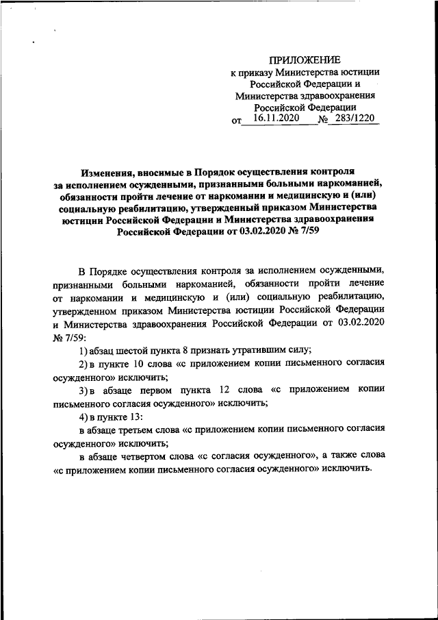ПРИКАЗ Минюста РФ N 283, Минздрава РФ N 1220 от 16.11.2020
