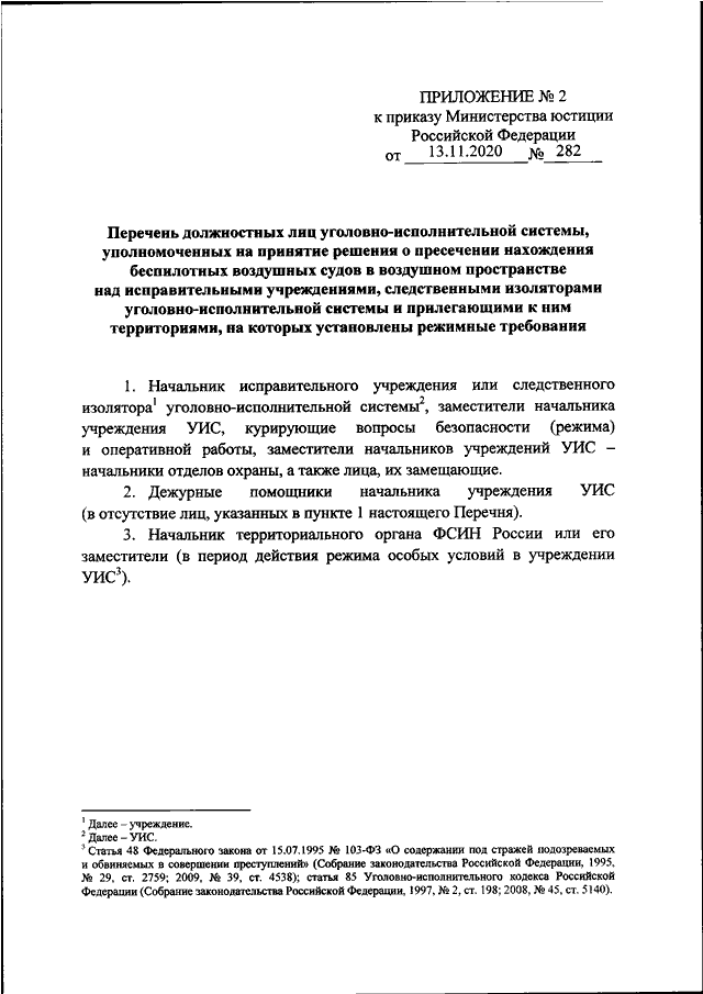 "ОБ УТВЕРЖДЕНИИ ПОРЯДКА ПРИНЯТИЯ РЕШЕНИЯ О ПРЕСЕЧЕНИИ НАХОЖДЕНИЯ БЕСПИЛОТНЫХ ВОЗДУШНЫХ СУДОВ В ВОЗДУШНОМ ПРОСТРАНСТВЕ НАД ИСПРАВИТЕЛЬНЫМИ УЧРЕЖДЕНИЯМИ, СЛЕДСТВЕННЫМИ ИЗОЛЯТОРАМИ УГОЛОВНО - ИСПОЛНИТЕЛЬНОЙ СИСТЕМЫ И ПРИЛЕГАЮЩИМИ К НИМ ТЕРРИТОРИЯМИ, НА КОТОРЫХ УСТАНОВЛЕНЫ РЕЖИМНЫЕ ТРЕБОВАНИЯ, А ТАКЖЕ ПЕРЕЧНЯ ДОЛЖНОСТНЫХ ЛИЦ УГОЛОВНО - ИСПОЛНИТЕЛЬНОЙ СИСТЕМЫ, УПОЛНОМОЧЕННЫХ НА ПРИНЯТИЕ ТАКОГО РЕШЕНИЯ"