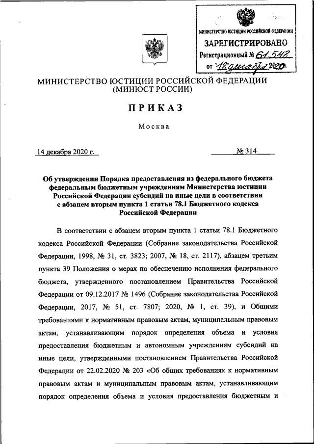 ПРИКАЗ Минюста РФ от 14.12.2020 N 314