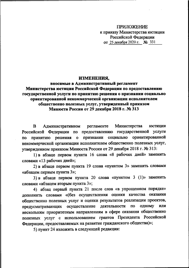 "О ВНЕСЕНИИ ИЗМЕНЕНИЙ В АДМИНИСТРАТИВНЫЙ РЕГЛАМЕНТ МИНИСТЕРСТВА ЮСТИЦИИ РОССИЙСКОЙ ФЕДЕРАЦИИ ПО ПРЕДОСТАВЛЕНИЮ ГОСУДАРСТВЕННОЙ УСЛУГИ ПО ПРИНЯТИЮ РЕШЕНИЯ О ПРИЗНАНИИ СОЦИАЛЬНО ОРИЕНТИРОВАННОЙ НЕКОММЕРЧЕСКОЙ ОРГАНИЗАЦИИ ИСПОЛНИТЕЛЕМ ОБЩЕСТВЕННО ПОЛЕЗНЫХ УСЛУГ, УТВЕРЖДЕННЫЙ ПРИКАЗОМ МИНЮСТА РОССИИ ОТ 29 ДЕКАБРЯ 2018 Г. N 313"