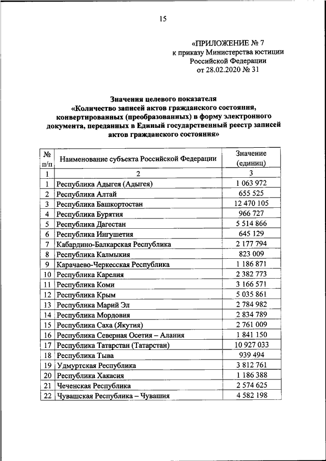 "О ВНЕСЕНИИ ИЗМЕНЕНИЙ В ПРИКАЗ МИНИСТЕРСТВА ЮСТИЦИИ РОССИЙСКОЙ ФЕДЕРАЦИИ ОТ 28.02.2020 N 31 "ОБ УТВЕРЖДЕНИИ ЗНАЧЕНИЙ ЦЕЛЕВЫХ ПОКАЗАТЕЛЕЙ ЭФФЕКТИВНОСТИ ДЕЯТЕЛЬНОСТИ ОРГАНОВ ГОСУДАРСТВЕННОЙ ВЛАСТИ СУБЪЕКТОВ РОССИЙСКОЙ ФЕДЕРАЦИИ И АДМИНИСТРАЦИИ Г. БАЙКОНУРА ПО ОСУЩЕСТВЛЕНИЮ ПЕРЕДАННЫХ ИМ ПОЛНОМОЧИЙ РОССИЙСКОЙ ФЕДЕРАЦИИ НА ГОСУДАРСТВЕННУЮ РЕГИСТРАЦИЮ АКТОВ ГРАЖДАНСКОГО СОСТОЯНИЯ НА 2020 ГОД"