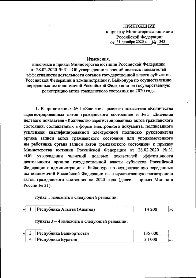 "О ВНЕСЕНИИ ИЗМЕНЕНИЙ В ПРИКАЗ МИНИСТЕРСТВА ЮСТИЦИИ РОССИЙСКОЙ ФЕДЕРАЦИИ ОТ 28.02.2020 N 31 "ОБ УТВЕРЖДЕНИИ ЗНАЧЕНИЙ ЦЕЛЕВЫХ ПОКАЗАТЕЛЕЙ ЭФФЕКТИВНОСТИ ДЕЯТЕЛЬНОСТИ ОРГАНОВ ГОСУДАРСТВЕННОЙ ВЛАСТИ СУБЪЕКТОВ РОССИЙСКОЙ ФЕДЕРАЦИИ И АДМИНИСТРАЦИИ Г. БАЙКОНУРА ПО ОСУЩЕСТВЛЕНИЮ ПЕРЕДАННЫХ ИМ ПОЛНОМОЧИЙ РОССИЙСКОЙ ФЕДЕРАЦИИ НА ГОСУДАРСТВЕННУЮ РЕГИСТРАЦИЮ АКТОВ ГРАЖДАНСКОГО СОСТОЯНИЯ НА 2020 ГОД"