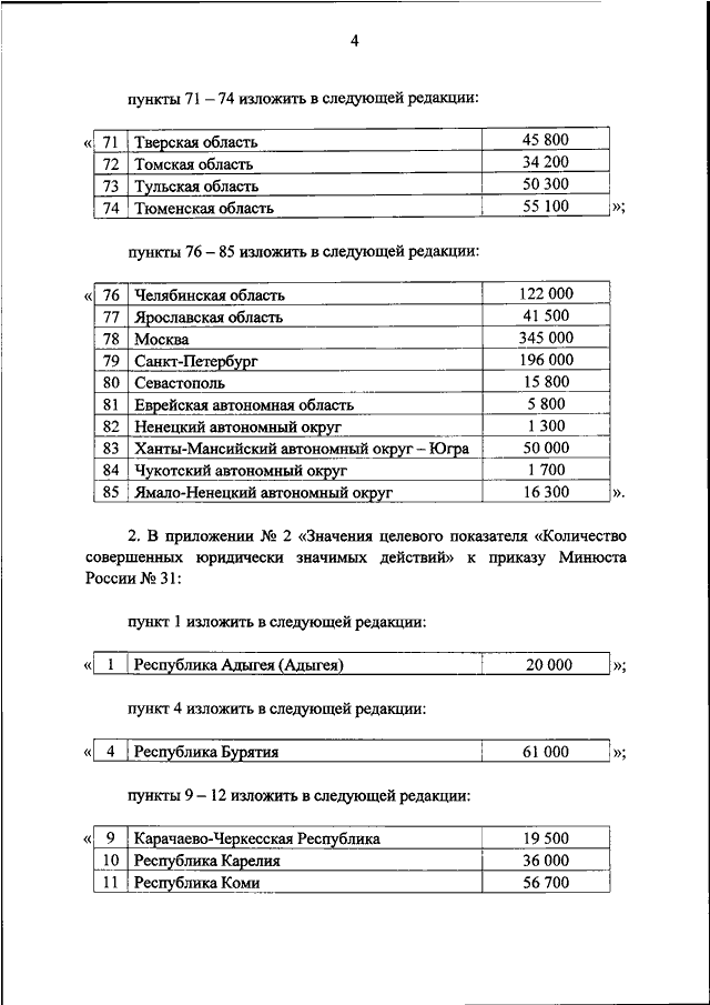"О ВНЕСЕНИИ ИЗМЕНЕНИЙ В ПРИКАЗ МИНИСТЕРСТВА ЮСТИЦИИ РОССИЙСКОЙ ФЕДЕРАЦИИ ОТ 28.02.2020 N 31 "ОБ УТВЕРЖДЕНИИ ЗНАЧЕНИЙ ЦЕЛЕВЫХ ПОКАЗАТЕЛЕЙ ЭФФЕКТИВНОСТИ ДЕЯТЕЛЬНОСТИ ОРГАНОВ ГОСУДАРСТВЕННОЙ ВЛАСТИ СУБЪЕКТОВ РОССИЙСКОЙ ФЕДЕРАЦИИ И АДМИНИСТРАЦИИ Г. БАЙКОНУРА ПО ОСУЩЕСТВЛЕНИЮ ПЕРЕДАННЫХ ИМ ПОЛНОМОЧИЙ РОССИЙСКОЙ ФЕДЕРАЦИИ НА ГОСУДАРСТВЕННУЮ РЕГИСТРАЦИЮ АКТОВ ГРАЖДАНСКОГО СОСТОЯНИЯ НА 2020 ГОД"