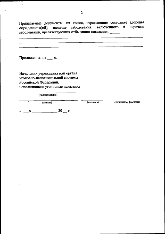 "ОБ УТВЕРЖДЕНИИ ФОРМ НАПРАВЛЕНИЯ НА МЕДИЦИНСКОЕ ОСВИДЕТЕЛЬСТВОВАНИЕ ОСУЖДЕННОГО, ХОДАТАЙСТВУЮЩЕГО ОБ ОСВОБОЖДЕНИИ (ПРЕДСТАВЛЯЕМОГО К ОСВОБОЖДЕНИЮ) ОТ ОТБЫВАНИЯ НАКАЗАНИЯ В СВЯЗИ С БОЛЕЗНЬЮ, ЗАКЛЮЧЕНИЯ ВРАЧЕБНОЙ КОМИССИИ МЕДИЦИНСКОЙ ОРГАНИЗАЦИИ УГОЛОВНО - ИСПОЛНИТЕЛЬНОЙ СИСТЕМЫ РОССИЙСКОЙ ФЕДЕРАЦИИ О НАЛИЧИИ ИЛИ ОТСУТСТВИИ У ОСУЖДЕННОГО ЗАБОЛЕВАНИЯ, ПРЕПЯТСТВУЮЩЕГО ОТБЫВАНИЮ НАКАЗАНИЯ, И ЖУРНАЛА РЕГИСТРАЦИИ МЕДИЦИНСКИХ ОСВИДЕТЕЛЬСТВОВАНИЙ ОСУЖДЕННЫХ, ХОДАТАЙСТВУЮЩИХ ОБ ОСВОБОЖДЕНИИ (ПРЕДСТАВЛЯЕМЫХ К ОСВОБОЖДЕНИЮ) ОТ ОТБЫВАНИЯ НАКАЗАНИЯ В СВЯЗИ С БОЛЕЗНЬЮ"