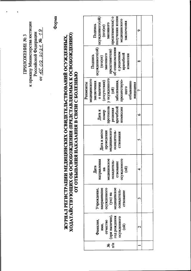 "ОБ УТВЕРЖДЕНИИ ФОРМ НАПРАВЛЕНИЯ НА МЕДИЦИНСКОЕ ОСВИДЕТЕЛЬСТВОВАНИЕ ОСУЖДЕННОГО, ХОДАТАЙСТВУЮЩЕГО ОБ ОСВОБОЖДЕНИИ (ПРЕДСТАВЛЯЕМОГО К ОСВОБОЖДЕНИЮ) ОТ ОТБЫВАНИЯ НАКАЗАНИЯ В СВЯЗИ С БОЛЕЗНЬЮ, ЗАКЛЮЧЕНИЯ ВРАЧЕБНОЙ КОМИССИИ МЕДИЦИНСКОЙ ОРГАНИЗАЦИИ УГОЛОВНО - ИСПОЛНИТЕЛЬНОЙ СИСТЕМЫ РОССИЙСКОЙ ФЕДЕРАЦИИ О НАЛИЧИИ ИЛИ ОТСУТСТВИИ У ОСУЖДЕННОГО ЗАБОЛЕВАНИЯ, ПРЕПЯТСТВУЮЩЕГО ОТБЫВАНИЮ НАКАЗАНИЯ, И ЖУРНАЛА РЕГИСТРАЦИИ МЕДИЦИНСКИХ ОСВИДЕТЕЛЬСТВОВАНИЙ ОСУЖДЕННЫХ, ХОДАТАЙСТВУЮЩИХ ОБ ОСВОБОЖДЕНИИ (ПРЕДСТАВЛЯЕМЫХ К ОСВОБОЖДЕНИЮ) ОТ ОТБЫВАНИЯ НАКАЗАНИЯ В СВЯЗИ С БОЛЕЗНЬЮ"