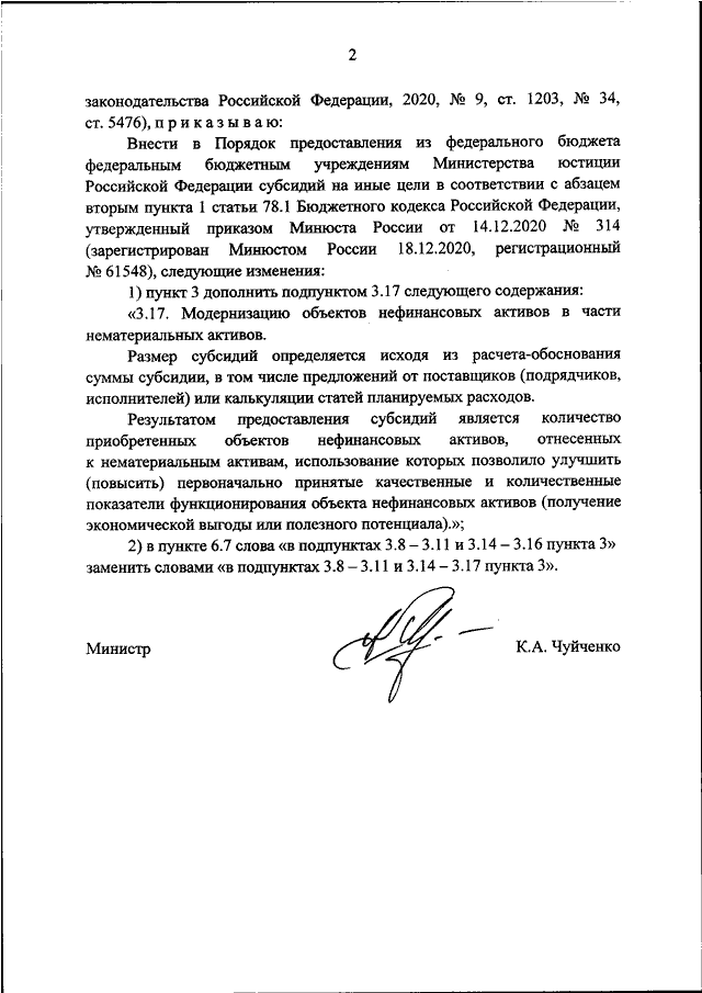 "О ВНЕСЕНИИ ИЗМЕНЕНИЙ В ПОРЯДОК ПРЕДОСТАВЛЕНИЯ ИЗ ФЕДЕРАЛЬНОГО БЮДЖЕТА ФЕДЕРАЛЬНЫМ БЮДЖЕТНЫМ УЧРЕЖДЕНИЯМ МИНИСТЕРСТВА ЮСТИЦИИ РОССИЙСКОЙ ФЕДЕРАЦИИ СУБСИДИЙ НА ИНЫЕ ЦЕЛИ В СООТВЕТСТВИИ С АБЗАЦЕМ ВТОРЫМ ПУНКТА 1 СТАТЬИ 78.1 БЮДЖЕТНОГО КОДЕКСА РОССИЙСКОЙ ФЕДЕРАЦИИ, УТВЕРЖДЕННЫЙ ПРИКАЗОМ МИНЮСТА РОССИИ ОТ 14.12.2020 N 314"