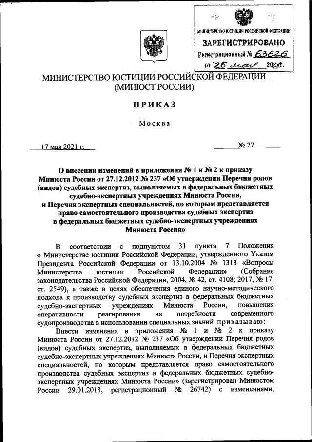 ПРИКАЗ Минюста РФ от 17.05.2021 N 77