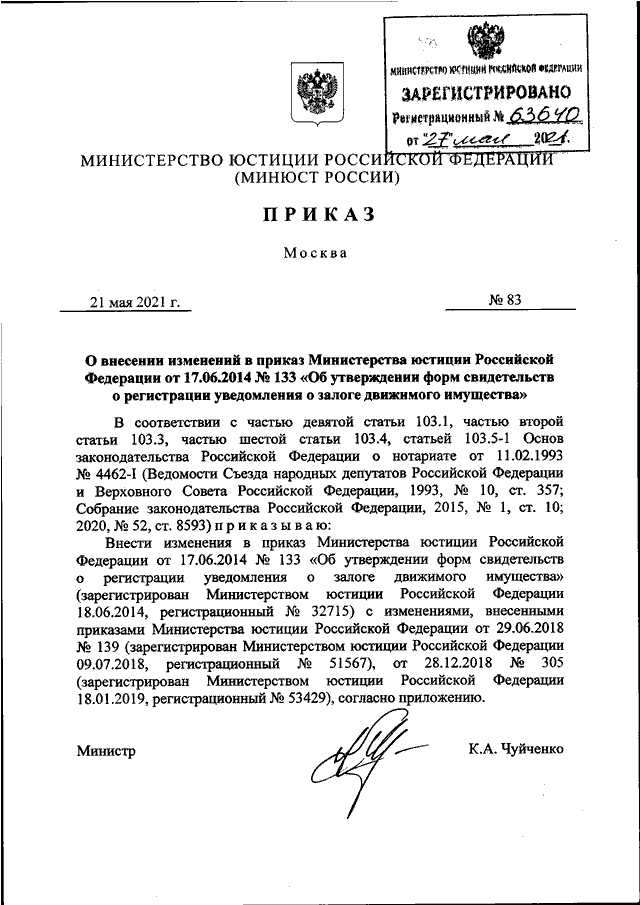 ПРИКАЗ Минюста РФ от 21.05.2021 N 83