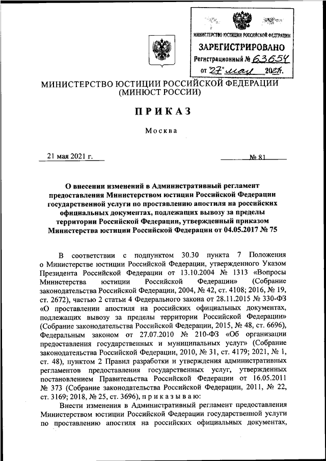 ПРИКАЗ Минюста РФ от 21.05.2021 N 81
