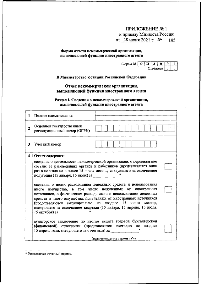 "О ФОРМЕ И СРОКАХ ПРЕДСТАВЛЕНИЯ В МИНИСТЕРСТВО ЮСТИЦИИ РОССИЙСКОЙ ФЕДЕРАЦИИ ОТЧЕТНОСТИ НЕКОММЕРЧЕСКИХ ОРГАНИЗАЦИЙ, ВЫПОЛНЯЮЩИХ ФУНКЦИИ ИНОСТРАННОГО АГЕНТА"