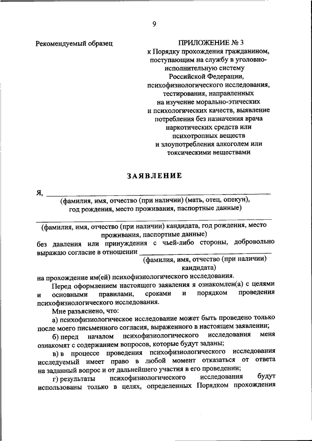 "ОБ УТВЕРЖДЕНИИ ПОРЯДКА ПРОХОЖДЕНИЯ ГРАЖДАНИНОМ, ПОСТУПАЮЩИМ НА СЛУЖБУ В УГОЛОВНО - ИСПОЛНИТЕЛЬНУЮ СИСТЕМУ РОССИЙСКОЙ ФЕДЕРАЦИИ, ПСИХОФИЗИОЛОГИЧЕСКОГО ИССЛЕДОВАНИЯ, ТЕСТИРОВАНИЯ, НАПРАВЛЕННЫХ НА ИЗУЧЕНИЕ МОРАЛЬНО - ЭТИЧЕСКИХ И ПСИХОЛОГИЧЕСКИХ КАЧЕСТВ, ВЫЯВЛЕНИЕ ПОТРЕБЛЕНИЯ БЕЗ НАЗНАЧЕНИЯ ВРАЧА НАРКОТИЧЕСКИХ СРЕДСТВ ИЛИ ПСИХОТРОПНЫХ ВЕЩЕСТВ И ЗЛОУПОТРЕБЛЕНИЯ АЛКОГОЛЕМ ИЛИ ТОКСИЧЕСКИМИ ВЕЩЕСТВАМИ"
