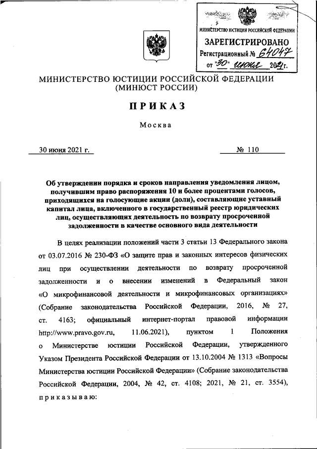 ПРИКАЗ Минюста РФ от 30.06.2021 N 110