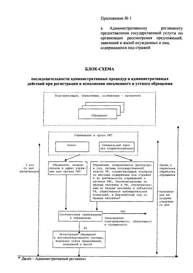 "ОБ УТВЕРЖДЕНИИ АДМИНИСТРАТИВНОГО РЕГЛАМЕНТА ПРЕДОСТАВЛЕНИЯ ГОСУДАРСТВЕННОЙ УСЛУГИ ПО ОРГАНИЗАЦИИ РАССМОТРЕНИЯ ПРЕДЛОЖЕНИЙ, ЗАЯВЛЕНИЙ И ЖАЛОБ ОСУЖДЕННЫХ И ЛИЦ, СОДЕРЖАЩИХСЯ ПОД СТРАЖЕЙ"