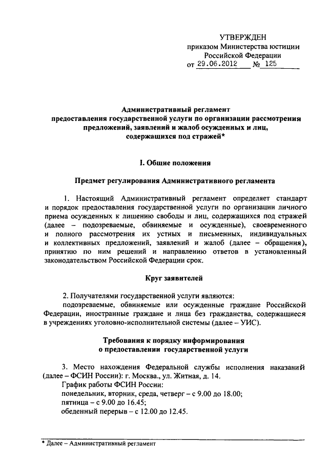 ПРИКАЗ Минюста РФ от 29.06.2012 N 125