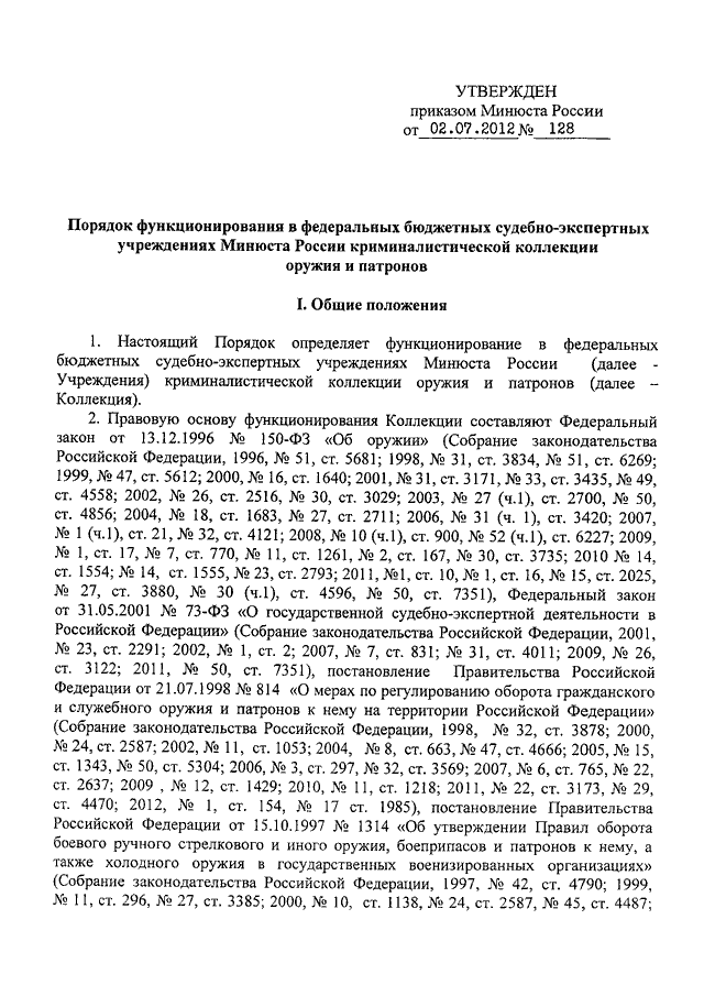 "ОБ УТВЕРЖДЕНИИ ПОРЯДКА ФУНКЦИОНИРОВАНИЯ В ФЕДЕРАЛЬНЫХ БЮДЖЕТНЫХ СУДЕБНО - ЭКСПЕРТНЫХ УЧРЕЖДЕНИЯХ МИНЮСТА РОССИИ КРИМИНАЛИСТИЧЕСКОЙ КОЛЛЕКЦИИ ОРУЖИЯ И ПАТРОНОВ"