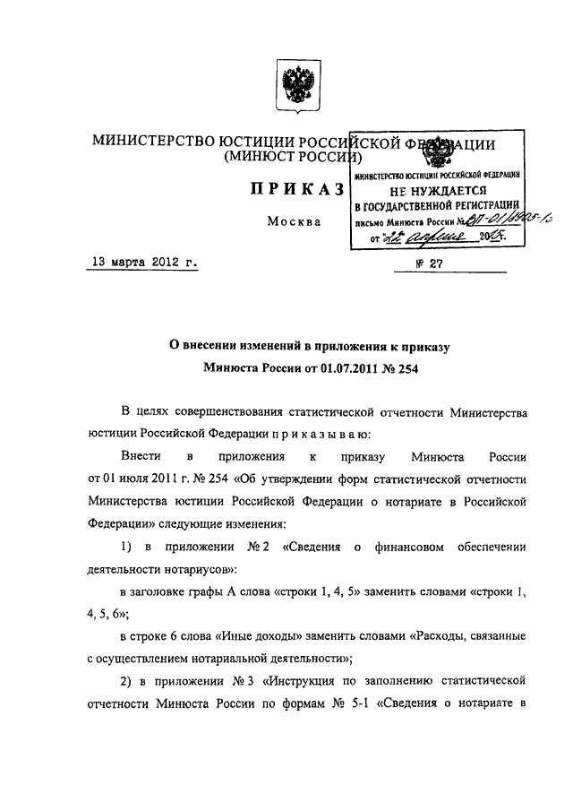 ПРИКАЗ Минюста РФ от 13.03.2012 N 27
