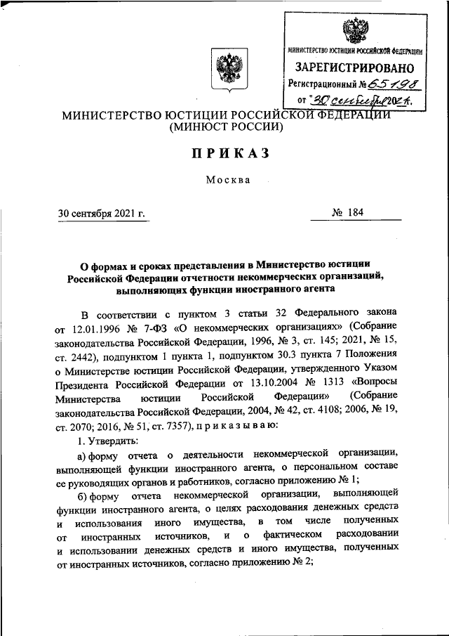 ПРИКАЗ Минюста РФ от 30.09.2021 N 184