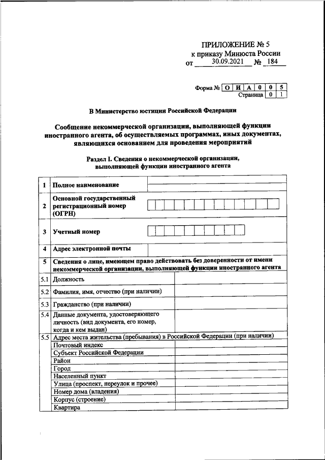 ПРИКАЗ Минюста РФ от 30.09.2021 N 184