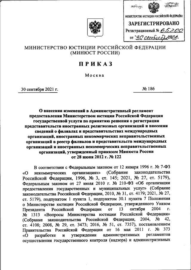 ПРИКАЗ Минюста РФ от 30.09.2021 N 186