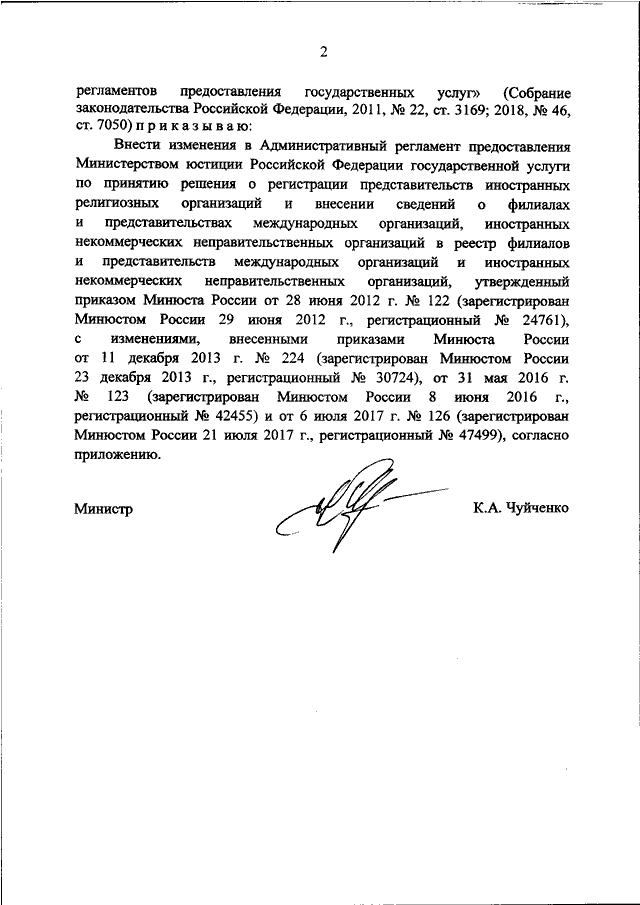 "О ВНЕСЕНИИ ИЗМЕНЕНИЙ В АДМИНИСТРАТИВНЫЙ РЕГЛАМЕНТ ПРЕДОСТАВЛЕНИЯ МИНИСТЕРСТВОМ ЮСТИЦИИ РОССИЙСКОЙ ФЕДЕРАЦИИ ГОСУДАРСТВЕННОЙ УСЛУГИ ПО ПРИНЯТИЮ РЕШЕНИЯ О РЕГИСТРАЦИИ ПРЕДСТАВИТЕЛЬСТВ ИНОСТРАННЫХ РЕЛИГИОЗНЫХ ОРГАНИЗАЦИЙ И ВНЕСЕНИИ СВЕДЕНИЙ О ФИЛИАЛАХ И ПРЕДСТАВИТЕЛЬСТВАХ МЕЖДУНАРОДНЫХ ОРГАНИЗАЦИЙ, ИНОСТРАННЫХ НЕКОММЕРЧЕСКИХ НЕПРАВИТЕЛЬСТВЕННЫХ ОРГАНИЗАЦИЙ В РЕЕСТР ФИЛИАЛОВ И ПРЕДСТАВИТЕЛЬСТВ МЕЖДУНАРОДНЫХ ОРГАНИЗАЦИЙ И ИНОСТРАННЫХ НЕКОММЕРЧЕСКИХ НЕПРАВИТЕЛЬСТВЕННЫХ ОРГАНИЗАЦИЙ, УТВЕРЖДЕННЫЙ ПРИКАЗОМ МИНЮСТА РОССИИ ОТ 28 ИЮНЯ 2012 Г. N 122"