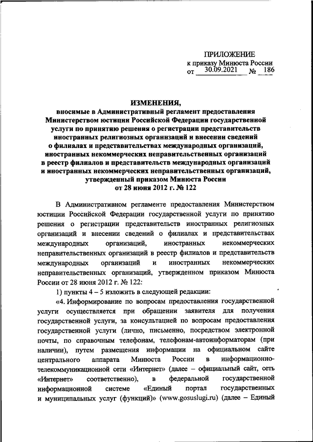 ПРИКАЗ Минюста РФ от 30.09.2021 N 186